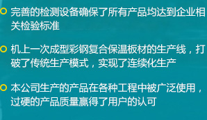 公司是一家瞄準國際、國內市場,集科、工、貿于一體的綜合性公司,擁有各類先進的設備100余臺(套),公司自主研發(fā)了新型保溫材料及彩鋼復合保溫板材連續(xù)生產工藝,建成了機上一次成型彩鋼復合保溫板材的生產線...